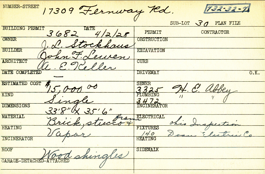 17309 Fernway Road Shaker Heights, OH 44120 PARCEL ID: 732-32-007 Building Permit Date: 04-02-1928 Plan File Number: 0 Neighborhood: Fernway Owner: Stockhaus, J. L. Builder: Lewen, John F. Architect: Keller, Arthur Emil Estimated Cost: 15000 Kind: Single, Single Residence or Dwelling Material: Brick and Stucco and Frame Heating: Vapor Roof: Wood Shingle |