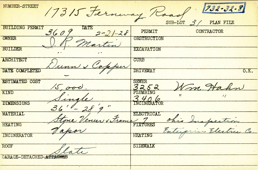 17315 Fernway Road Shaker Heights, OH 44120 PARCEL ID: 732-32-008 Building Permit Date: 02-21-1928 Plan File Number: 2916 all scanned Microfilm Roll: Roll041 Neighborhood: Fernway Owner: Martin, J. R. Builder: Martin, J. R. Architect: Dunn and Copper Estimated Cost: 15000 Kind: Single, Single Residence or Dwelling Material: Stone Veneer and Frame Heating: Vapor Roof: Slate Garage: detached |