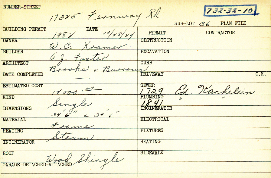 17325 Fernway Road Shaker Heights, OH 44120 PARCEL ID: 732-32-010 Building Permit Date: 10-28-1924 Neighborhood: Fernway Owner: Kramer, W. C. Builder: Foster, A. J. Architect: Brooke and Burrows Estimated Cost: 12000 Kind: Single, Single Residence or Dwelling Material: Frame Heating: Steam Roof: Wood Shingle Blueprints: no blueprints on microfilm |