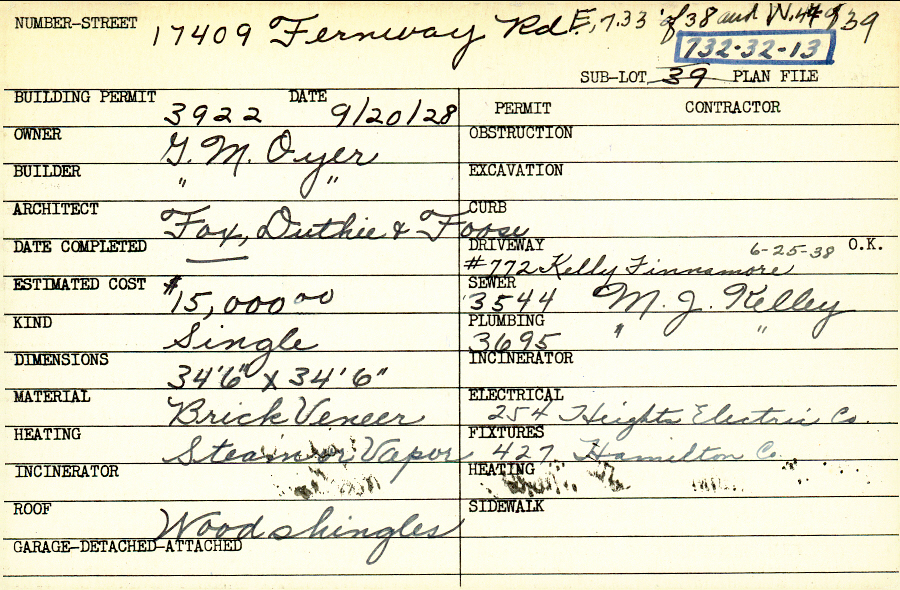 17409 Fernway Road Shaker Heights, OH 44120 PARCEL ID: 732-32-013 Building Permit Date: 09-20-1928 Plan File Number: 5445 Microfilm Roll: Roll#74 Neighborhood: Fernway Owner: Oyer, George M. Builder: Oyer, George M. Architect: Fox, Duthie and Foose Estimated Cost: 15000 Kind: Single, Single Residence or Dwelling Material: Brick Veneer Heating: Steam Roof: Wood Shingle |