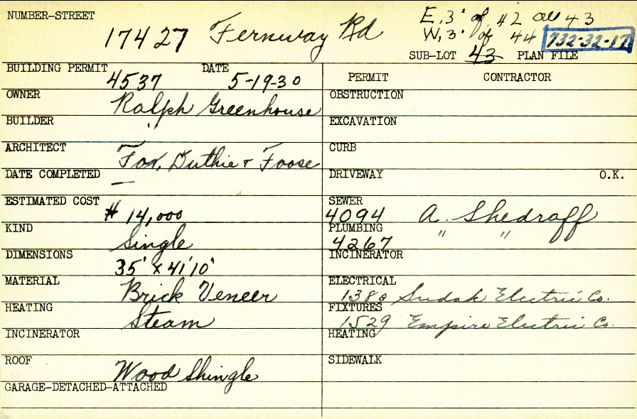 17427 Fernway Road Shaker Heights, OH 44120 PARCEL ID: 732-32-017 Building Permit Date: 05-19-1930 Plan File Number: 0 Neighborhood: Fernway Owner: Greenhouse, Ralph Builder: Greenhouse, Ralph Architect: Fox, Duthie and Foose Estimated Cost: 14000 Kind: Single, Single Residence or Dwelling Material: Brick Veneer Heating: Steam Roof: Wood Shingle Card Available: yes |