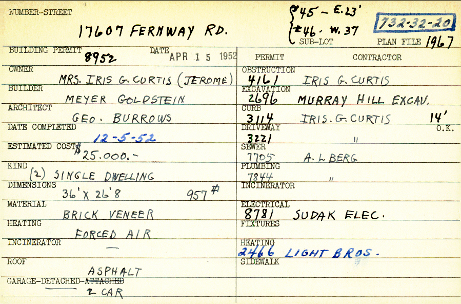 17607 Fernway Road Shaker Heights, OH 44120 PARCEL ID: 732-32-019 Building Permit Date: 04-15-1952 Plan File Number: 1830 scanned, 1967, 6234 Microfilm Roll: Roll027, Roll#29, Roll#84 Neighborhood: Fernway Owner: Curtis, Mrs. Iris G. (Jerome) Builder: Goldstein, Meyer Architect: Burrows, George Estimated Cost: 25000 Date Completed: 12-05-1952 Kind: Single, Single Residence or Dwelling (2) Material: Brick Veneer Heating: Forced Air Roof: Asphalt Garage: attached 2 car |