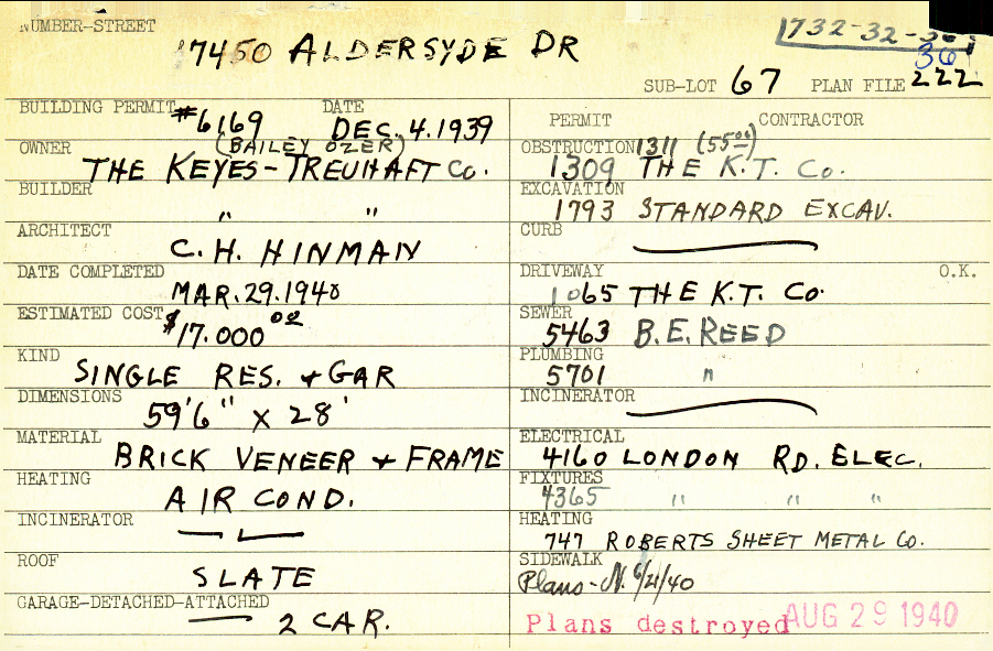 17450 Aldersyde Drive Shaker Heights, OH 44120 PARCEL ID: 732-32-036 Building Permit Date: 12-04-1939 Plan File Number: 1625 scanned, 4177, 4235, 5639 Microfilm Roll: Roll025, Roll#61, Roll#76 Neighborhood: Fernway Owner: The Keyes-Treuhaft Company (Bailey Ozer) Builder: The Keyes-Treuhaft Company Architect: Hinman, C. H. Estimated Cost: 17000 Date Completed: 03-29-1940 Kind: Single Dwelling and Garage Material: Brick Veneer and Frame Heating: Air Conditioned Roof: Slate Garage: attached 2 car |