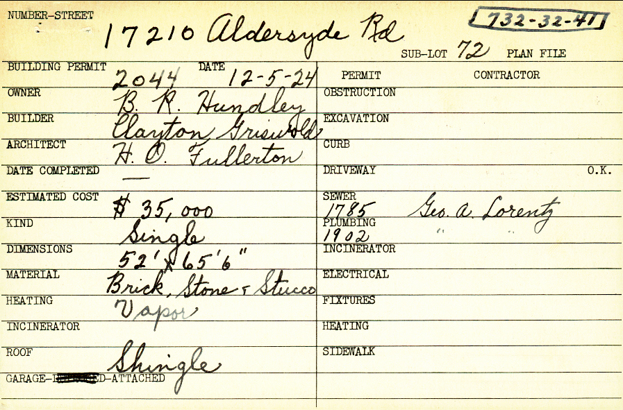 17210 Aldersyde Drive Shaker Heights, OH 44120 PARCEL ID: 732-32-041 Building Permit Date: 12-05-1924 Plan File Number: 0 Neighborhood: Fernway Owner: Hundley, B. R. Builder: Griswold, Clayton Architect: Fullerton, H. O. Estimated Cost: 35000 Kind: Single, Single Residence or Dwelling Material: Brick, Stone and Stucco Heating: Vapor Roof: Shingles Garage: attached Card Available: yes |  |
