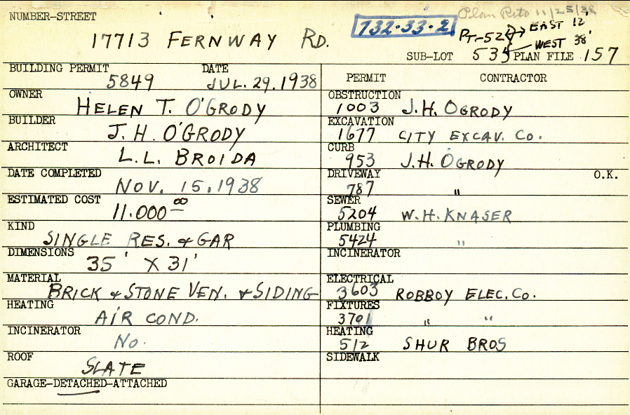 17713 Fernway Road Shaker Heights, OH 44120 PARCEL ID: 732-33-002 Building Permit Date: 07-29-1938 Plan File Number: 157 Neighborhood: Fernway Owner: Ogrody, Helen T. Builder: Ogrody, J.H. Architect: Broida, L. L. Estimated Cost: 11000 Date Completed: 11-15-1938 Kind: Single Dwelling and Garage Material: Brick and Stone Veneer and Siding Heating: Air Conditioned Roof: Slate Garage: detached Card Available: Yes |