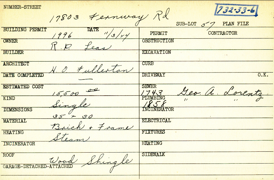 17803 Fernway Road Shaker Heights, OH 44122 PARCEL ID: 732-33-006 Building Permit Date: 11-03-1924 Plan File Number: 5935 all scanned Microfilm Roll: Roll080 Neighborhood: Fernway Owner: Leas, R. P. Architect: Fullerton, H. O. Estimated Cost: 15500 Kind: Single, Single Residence or Dwelling Material: Brick and Frame Heating: Steam Roof: Wood Shingle Blueprints: online, see link above |