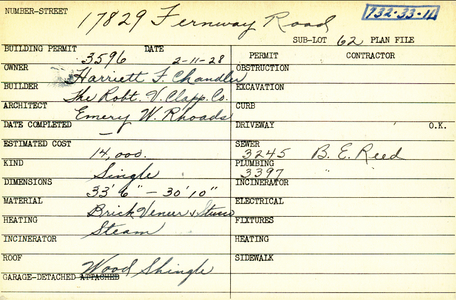 17829 Fernway Road Shaker Heights, OH 44122 PARCEL ID: 732-33-011 Building Permit Date: 02-11-1928 Plan File Number: 0 Neighborhood: Fernway Owner: Chandler, Harriet F. Builder: The Robert V. Clapp Company Architect: Rhoads, Emery W. Estimated Cost: 14000 Kind: Single, Single Residence or Dwelling Material: Brick Veneer and Stucco Heating: Steam Roof: Wood Shingle Garage: detached |