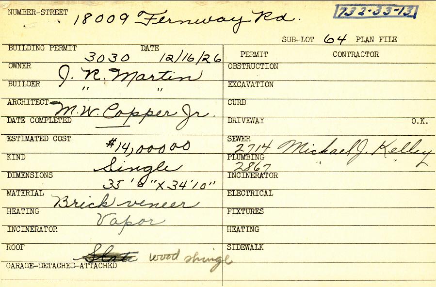18009 Fernway Road Shaker Heights, OH 44122 PARCEL ID: 732-33-013 Building Permit Date: 12-16-1926 Plan File Number: 7277, 10529 all scanned Microfilm Roll: Roll092, NewRoll04 Neighborhood: Fernway Owner: Martin, J. R. Builder: Martin, J. R. Architect: Copper, Munroe Walker Jr. Estimated Cost: 14000 Kind: Single, Single Residence or Dwelling Material: Brick Veneer Heating: Vapor Roof: Wood Shingle Blueprints: online, see link above |