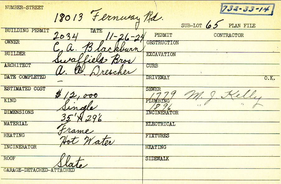 18013 Fernway Road Shaker Heights, OH 44122 PARCEL ID: 732-33-014 Building Permit Date: 11-26-1924 Plan File Number: 0 Neighborhood: Fernway Owner: Blackburn, C. A. Builder: Swaffield Brothers Architect: Drescher, A. A. Estimated Cost: 12000 Kind: Single, Single Residence or Dwelling Material: Frame Heating: Hot Water Roof: Slate |