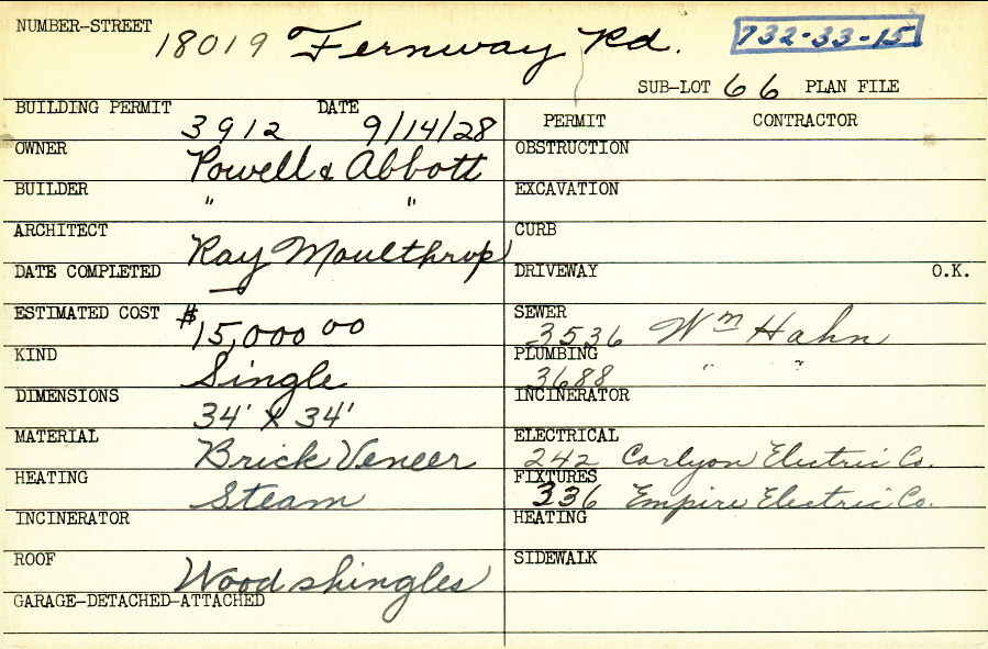 18019 Fernway Road Shaker Heights, OH 44122 PARCEL ID: 732-33-015 Building Permit Date: 09-14-1928 Neighborhood: Fernway Owner: Powell and Abbott Builder: Powell and Abbott Architect: Moulthrop, Ray Estimated Cost: 15000 Kind: Single, Single Residence or Dwelling Material: Brick Veneer Heating: Steam Roof: Wood Shingle Blueprints: no blueprints on microfilm |