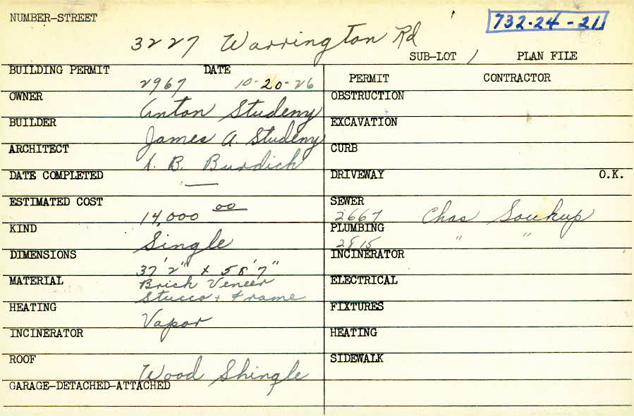 3227 Warrington Road Shaker Heights, OH 44120 PARCEL ID: 732-24-021 Building Permit Date: 10-20-1926 Plan File Number: 0 Neighborhood: Onaway Owner: Studeny, Anton Builder: Studeny, James A. Architect: Burdick, H. B. Estimated Cost: 14000 Kind: Single, Single Residence or Dwelling Material: Brick Veneer, Stucco and Frame Heating: Vapor Roof: Wood Shingle |