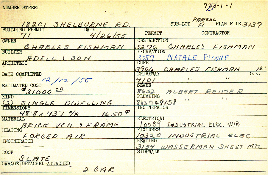 18201 Shelburne Road Shaker Heights, OH 44122 PARCEL ID: 733-01-001 Building Permit Date: 04-26-1955 Plan File Number: 3137 Microfilm Roll: Roll#44 Neighborhood: Malvern Owner: Fishman, Charles Builder: Adell and Son Estimated Cost: 31000 Date Completed: 12-12-1955 Kind: Single, Single Residence or Dwelling (2) Material: Brick Veneer and Frame Heating: Forced Air Roof: Slate Garage: attached 2 car |