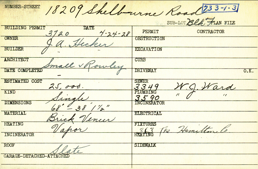 18209 Shelburne Road Shaker Heights, OH 44122 PARCEL ID: 733-01-003 Building Permit Date: 04-24-1928 Plan File Number: 2245, 2707 Microfilm Roll: Roll#33, Roll #37, Roll#32 Neighborhood: Malvern Owner: Hecker, J. A. Builder: Hecker, J. A. Architect: Phillip L. Small and Charles B. Rowley Estimated Cost: 25000 Kind: Single, Single Residence or Dwelling Material: Brick Veneer Heating: Vapor Roof: Slate |