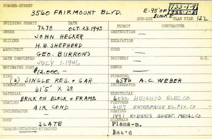 3560 Fairmount Boulevard Shaker Heights, OH 44120 PARCEL ID: 733-01-009 Building Permit Date: 10-23-1945 Plan File Number: 122 scanned, 2022 Microfilm Roll: Roll001, Roll#31 Neighborhood: Malvern Owner: Hecker, John Builder: Shepherd, H. W. Architect: Burrows, George Estimated Cost: 12000 Date Completed: 07-01-1946 Kind: Single Dwelling and Garage (2) Material: Brick on Block and Frame Heating: Air Conditioned Roof: Slate Garage: detached |