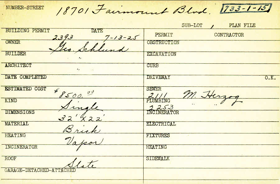 18701 Fairmount Boulevard Shaker Heights, OH 44120 PARCEL ID: 733-01-015 Building Permit Date: 07-13-1925 Plan File Number: 0 Neighborhood: Malvern Owner: Schlund, George Builder: Schlund, George Architect: Schlund, George Estimated Cost: 8500 Kind: Single, Single Residence or Dwelling Material: Brick Heating: Vapor Roof: Slate Card Available: yes |