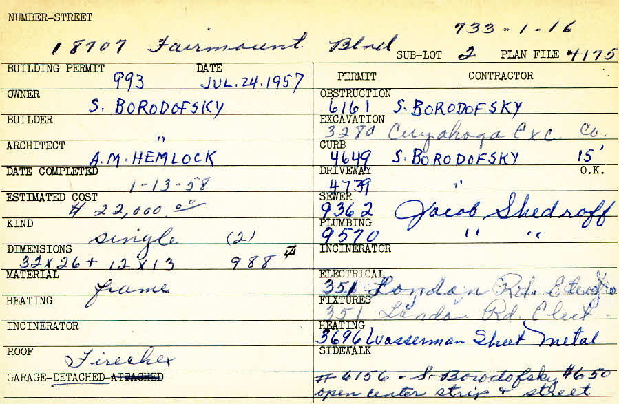 18707 Fairmount Boulevard Shaker Heights, OH 44120 PARCEL ID: 733-01-016 Building Permit Date: 07-24-1957 Plan File Number: 4175 Neighborhood: Malvern Owner: Borodofsky, S. Builder: Borodofsky, S. Architect: Hemlock, A. M. Estimated Cost: 22000 Date Completed: 01-13-1958 Kind: Single, Single Residence or Dwelling (2) Material: Frame Garage: detached Card Available: yes |