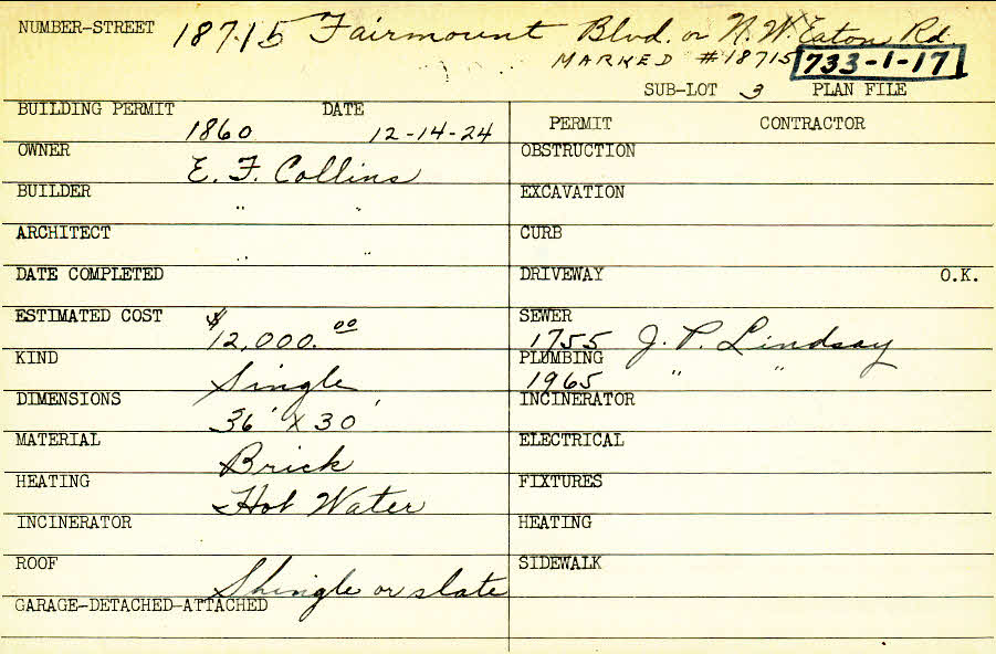 18715 Fairmount Boulevard Shaker Heights, OH 44120 PARCEL ID: 733-01-017 Building Permit Date: 12-14-1924 Plan File Number: 0 Neighborhood: Malvern Owner: Collins, E. F. Builder: Collins, E. F. Architect: Collins, E. F. Estimated Cost: 12000 Kind: Single, Single Residence or Dwelling Material: Brick Heating: Hot Water Roof: Shingles Card Available: yes |
