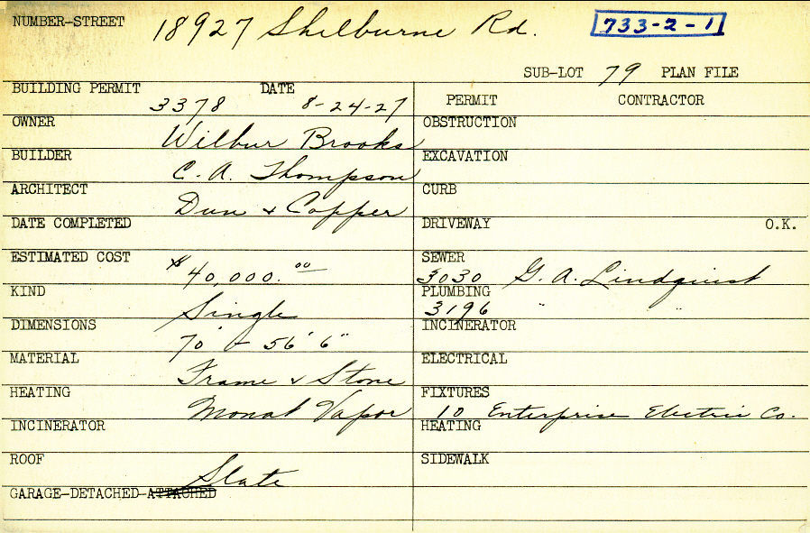 18927 Shelburne Road Shaker Heights, OH 44122 PARCEL ID: 733-02-001 Building Permit Date: 08-24-1927 Plan File Number: 0 Neighborhood: Malvern Owner: Brooks, Wilbur Builder: Thompson, C. A. Architect: Dunn and Copper Estimated Cost: 40000 Kind: Single, Single Residence or Dwelling Material: Frame and Stone Heating: Vapor Roof: Slate Garage: detached |