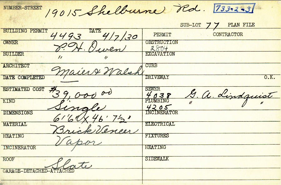 19015 Shelburne Road Shaker Heights, OH 44122 PARCEL ID: 733-02-003 Building Permit Date: 04-07-1930 Plan File Number: 0 Neighborhood: Malvern Owner: Owen, P. H. Builder: Owen, P. H. Architect: Maier and Walsh Estimated Cost: 39000 Kind: Single, Single Residence or Dwelling Material: Brick Veneer Heating: Vapor Roof: Slate Card Available: yes |