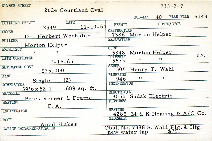 2624 Courtland Oval Shaker Heights, OH 44122 PARCEL ID: 733-02-007 Building Permit Date: 11-10-1964 Plan File Number: 6143 Microfilm Roll: Roll#83 Neighborhood: Malvern Owner: Wechsler, Dr. Herbert Builder: Helper, Morton Architect: Helper, Morton Estimated Cost: 35000 Date Completed: 07-16-1965 Kind: Single, Single Residence or Dwelling (2) Material: Brick Veneer and Frame Heating: Forced Air Roof: Wood Shakes |