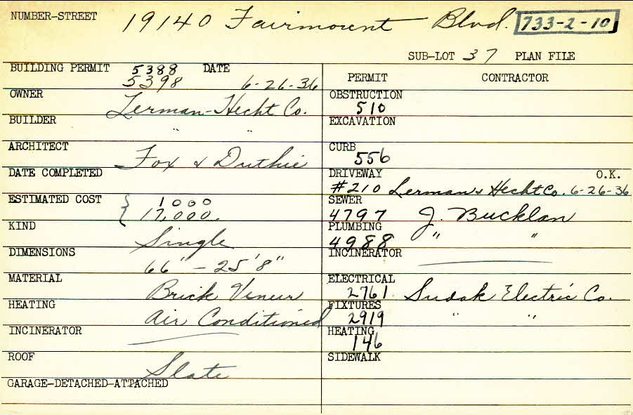 19140 Fairmount Boulevard Shaker Heights, OH 44120 PARCEL ID: 733-02-010 Building Permit Date: 06-26-1936 Plan File Number: 4956 Microfilm Roll: Roll#68 Neighborhood: Malvern Owner: Lerman-Hecht Company Builder: Lerman-Hecht Company Architect: Fox and Duthie Estimated Cost: 18000 Kind: Single, Single Residence or Dwelling Material: Brick Veneer Heating: Air Conditioned Roof: Slate |