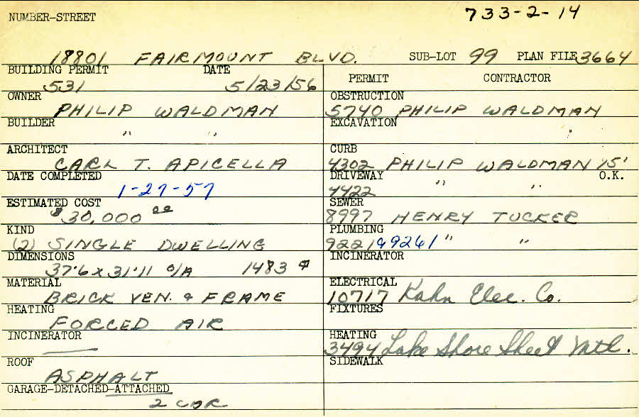 18801 Fairmount Boulevard Shaker Heights, OH 44120 PARCEL ID: 733-02-014 Building Permit Date: 05-23-1956 Plan File Number: 3664 Microfilm Roll: Roll#55 Neighborhood: Malvern Owner: Waldman, Philip Builder: Waldman, Philip Architect: Apicella, C. T. Estimated Cost: 30000 Date Completed: 01-27-1957 Kind: Single, Single Residence or Dwelling (2) Material: Brick Veneer and Frame Heating: Forced Air Roof: Asphalt Garage: attached 2 car |
