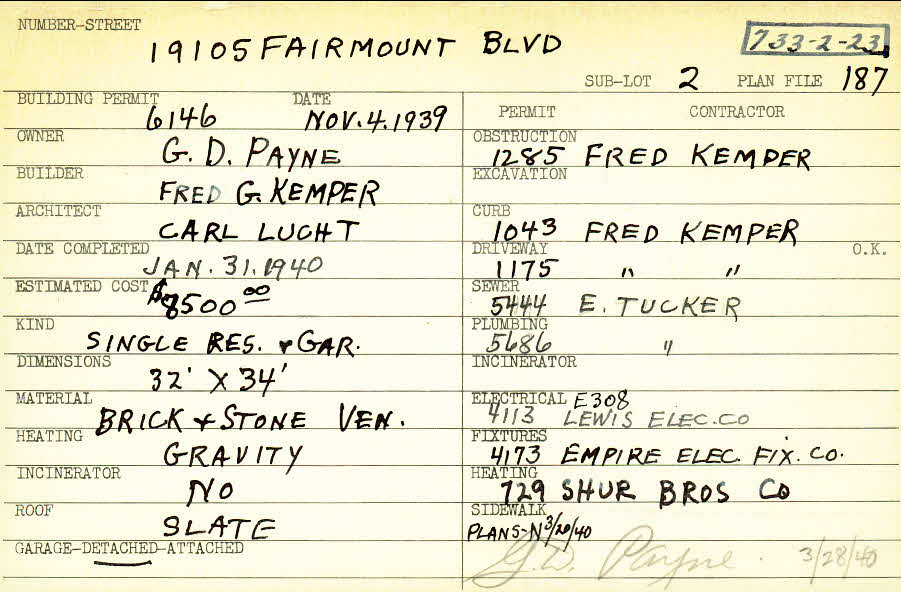 19105 Fairmount Boulevard Shaker Heights, OH 44120 PARCEL ID: 733-02-023 Building Permit Date: 11-04-1939 Plan File Number: 187 Neighborhood: Malvern Owner: Payne, G. D. Builder: Kemper, Fred G. Architect: Lucht, Carl Estimated Cost: 8500 Date Completed: 01-31-1940 Kind: Single Dwelling and Garage Material: Brick and Stone Veneer Heating: Gravity System Roof: Slate Garage: detached Card Available: yes |