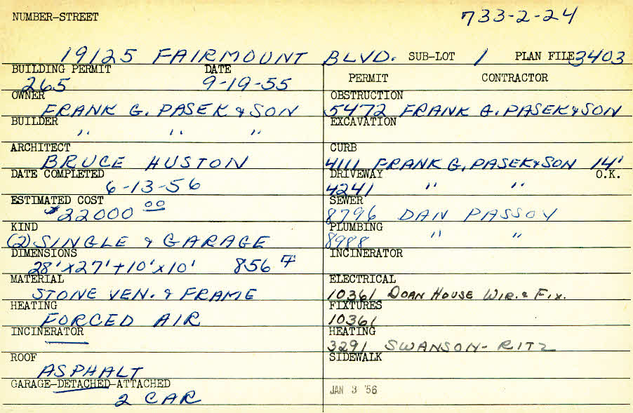 19125 Fairmount Boulevard Shaker Heights, OH 44120 PARCEL ID: 733-02-024 Building Permit Date: 09-19-1955 Plan File Number: 3403 Microfilm Roll: Roll#50 Neighborhood: Malvern Owner: Frank G. Pasek and Son Builder: Frank G. Pasek and Son Architect: Huston, Bruce Estimated Cost: 22000 Date Completed: 06-13-1956 Kind: Single Dwelling and Garage (2) Material: Stone Veneer and Frame Heating: Forced Air Roof: Asphalt Garage: detached 2 car |
