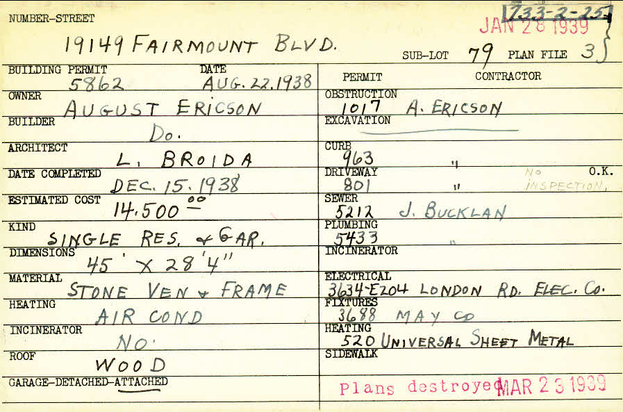 19149 Fairmount Boulevard Shaker Heights, OH 44120 PARCEL ID: 733-02-025 Building Permit Date: 08-22-1938 Plan File Number: 3 Neighborhood: Malvern Owner: Ericson, August Builder: Ericson, August Architect: Broida, L. Estimated Cost: 14500 Date Completed: 12-15-1938 Kind: Single Dwelling and Garage Material: Stone Veneer and Frame Heating: Air Conditioned Roof: Wood Garage: attached Card Available: yes |