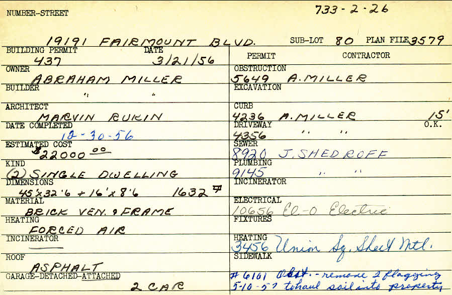 19191 Fairmount Boulevard Shaker Heights, OH 44120 PARCEL ID: 733-02-026 Building Permit Date: 03-21-1956 Plan File Number: 3579 Microfilm Roll: Roll#52 Neighborhood: Malvern Owner: Miller, Abraham Builder: Miller, Abraham Architect: Rukin, Marvin Estimated Cost: 22000 Date Completed: 12-30-1956 Kind: Single, Single Residence or Dwelling (2) Material: Brick Veneer and Frame Heating: Forced Air Roof: Asphalt Garage: attached 2 car |