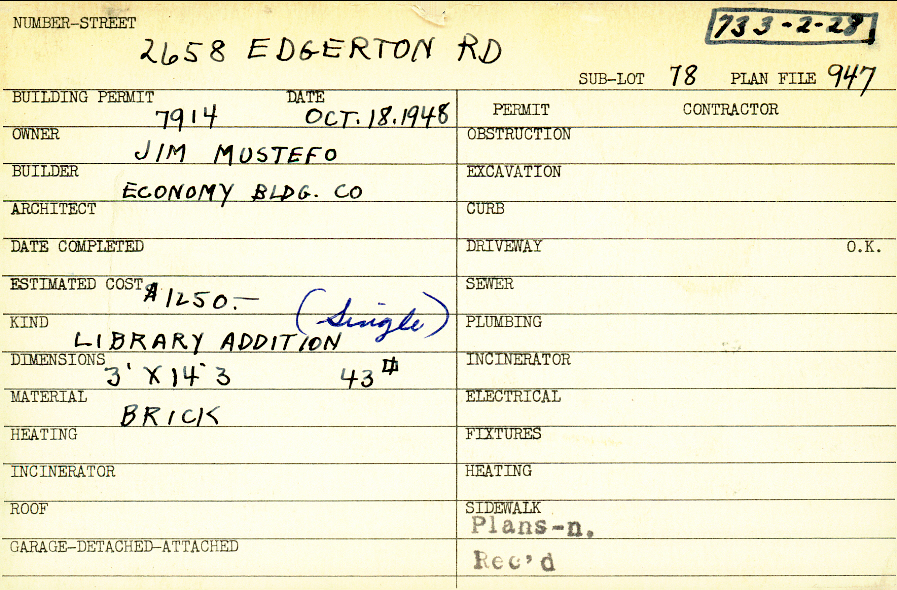 2658 Edgerton Road Shaker Heights, OH 44122 PARCEL ID: 733-02-028 Building Permit Date: 10-18-1948 Plan File Number: 947 scanned, 11279 Microfilm Roll: Roll012, NewRoll#7 Neighborhood: Malvern Owner: Mustefo, Jim Builder: Economy Building Company Estimated Cost: 1250 Material: Brick |