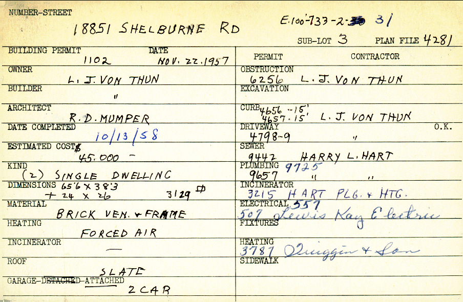 18851 Shelburne Road Shaker Heights, OH 44122 PARCEL ID: 733-02-031 Building Permit Date: 11-22-1957 Plan File Number: 4281 scanned, 5213 Microfilm Roll: Roll062, Roll#72 Neighborhood: Malvern Owner: Von Thun, L. J. Builder: Von Thun, L. J. Architect: Mumper, R. D. Estimated Cost: 45000 Date Completed: 10-13-1958 Kind: Single, Single Residence or Dwelling (2) Material: Brick Veneer and Frame Heating: Forced Air Roof: Slate Garage: attached 2 car |