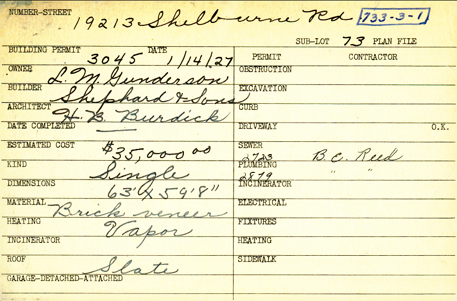 19213 Shelburne Road Shaker Heights, OH 44122 PARCEL ID: 733-03-001 Building Permit Date: 01-14-1927 Plan File Number: 10974 Microfilm Roll: NewRoll#6 Neighborhood: Malvern Owner: Gunderson, L. M. Builder: Shephard and Sons Architect: Burdick, H. B. Estimated Cost: 35000 Kind: Single, Single Residence or Dwelling Material: Brick Veneer Heating: Vapor Roof: Slate |