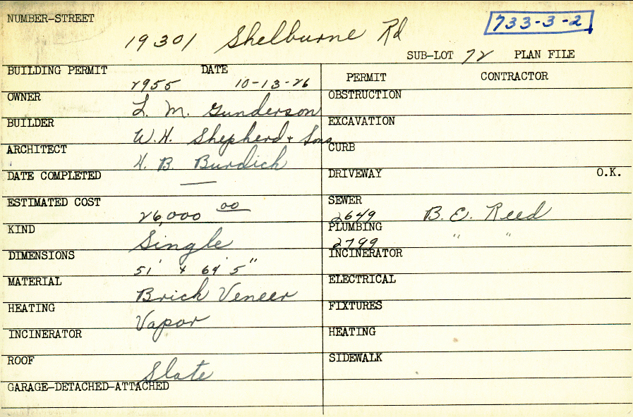 19301 Shelburne Road Shaker Heights, OH 44122 PARCEL ID: 733-03-002 Building Permit Date: 10-13-1926 Neighborhood: Malvern Owner: Gunderson, L. M. Builder: W. H. Shepherd and Sons Architect: Burdick, H. B. Estimated Cost: 26000 Kind: Single, Single Residence or Dwelling Material: Brick Veneer Heating: Vapor Roof: Slate Blueprints: no blueprints on microfilm |