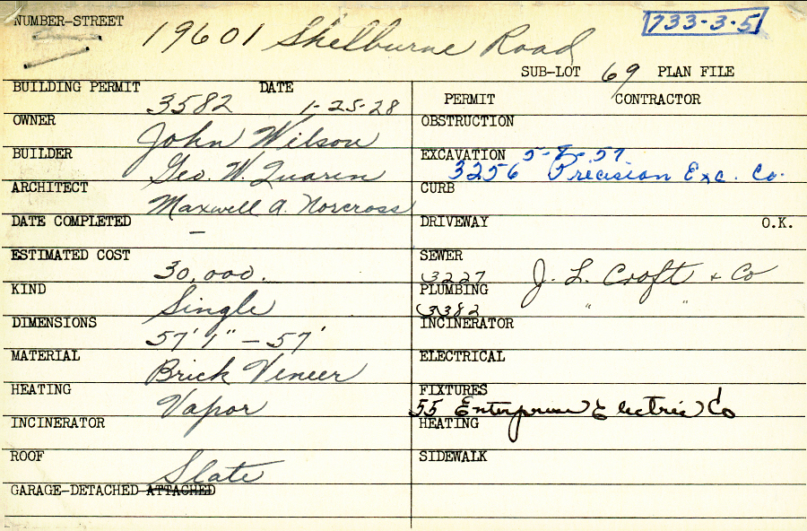 19601 Shelburne Road Shaker Heights, OH 44122 PARCEL ID: 733-03-005 Building Permit Date: 01-25-1928 Plan File Number: 12387, 12397 Microfilm Roll: NewRoll#12 Neighborhood: Malvern Owner: Wilson, John Builder: Quarm, George W. Architect: Norcross, Maxwell A. Estimated Cost: 30000 Kind: Single, Single Residence or Dwelling Material: Brick Veneer Heating: Vapor Roof: Slate Garage: detached |