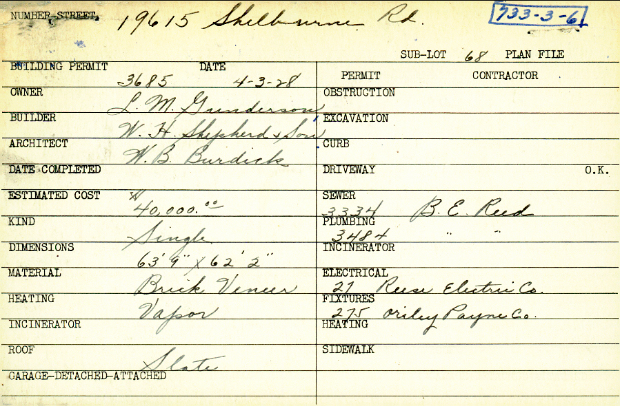 19615 Shelburne Road Shaker Heights, OH 44122 PARCEL ID: 733-03-006 Building Permit Date: 04-03-1928 Plan File Number: 6339 Microfilm Roll: Roll#85 Neighborhood: Malvern Owner: Gunderson, L. M. Builder: W. H. Shepherd and Sons Architect: Burdick, W. B. Estimated Cost: 40000 Kind: Single, Single Residence or Dwelling Material: Brick Veneer Heating: Vapor Roof: Slate |