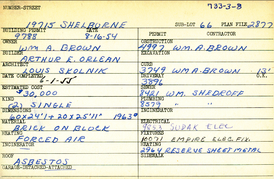 19715 Shelburne Road Shaker Heights, OH 44122 PARCEL ID: 733-03-008 Building Permit Date: 08-16-1954 Plan File Number: 2877 scanned Microfilm Roll: Roll041 Neighborhood: Malvern Owner: Brown, William A. Builder: Orlean, Arthur E. Architect: Skolnik, Louis Estimated Cost: 30000 Date Completed: 06-01-1955 Kind: Single, Single Residence or Dwelling (2) Material: Brick on Block Heating: Forced Air Roof: Asbestos Garage: attached |