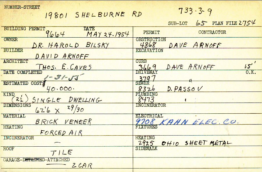 19801 Shelburne Road Shaker Heights, OH 44122 PARCEL ID: 733-03-009 Building Permit Date: 05-24-1954 Plan File Number: 2754 Microfilm Roll: Roll #38 Neighborhood: Malvern Owner: Bilsky, Dr. Harold Builder: Arnoff, David Architect: Caves, Thomas E. Estimated Cost: 40000 Date Completed: 01-31-1955 Kind: Single 2-1/2 Material: Brick Veneer Heating: Forced Air Roof: Tile Garage: attached 2 car |