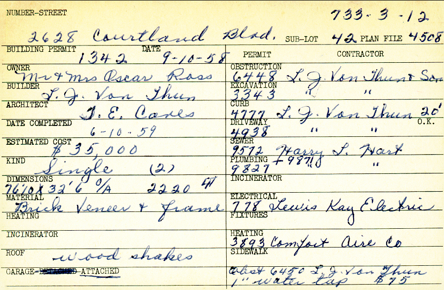 2628 Courtland Boulevard Shaker Heights, OH 44122 PARCEL ID: 733-03-012 Building Permit Date: 09-10-1958 Plan File Number: 4508 Microfilm Roll: Roll#63 Neighborhood: Malvern Owner: Ross, Mr. and Mrs. Oscar Builder: Von Thun, L. J. Architect: Caves, T. E. Estimated Cost: 35000 Date Completed: 06-10-1959 Kind: Single, Single Residence or Dwelling (2) Material: Brick Veneer and Frame Roof: Wood Shakes Garage: attached |
