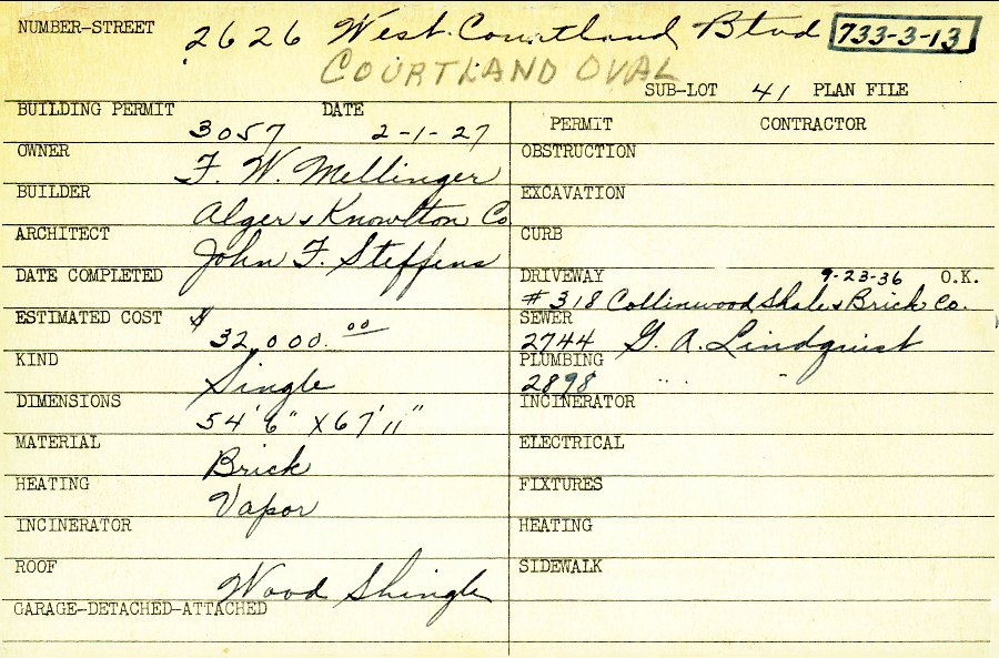 2626 Courtland Oval Shaker Heights, OH 44122 PARCEL ID: 733-03-013 Building Permit Date: 02-01-1927 Plan File Number: 0 Neighborhood: Malvern Owner: Mellinger, F. W. Builder: Alger and Knowlton Company Architect: Steffens, John F. Estimated Cost: 32000 Kind: Single, Single Residence or Dwelling Material: Brick Heating: Vapor Roof: Wood Shingle |