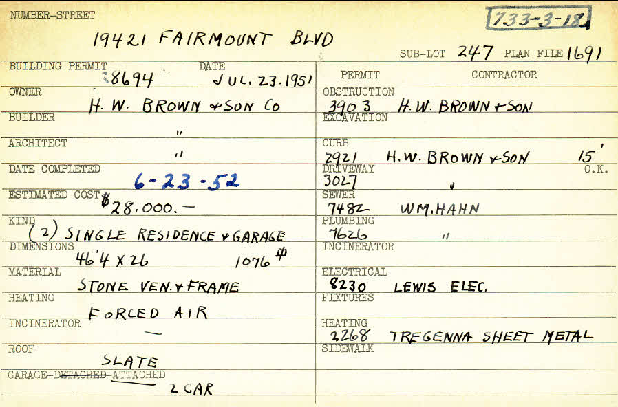 19421 Fairmount Boulevard Shaker Heights, OH 44120 PARCEL ID: 733-03-018 Building Permit Date: 07-23-1951 Plan File Number: 1691 scanned, 6244 Microfilm Roll: Roll026, Roll#84 Neighborhood: Malvern Owner: H. W. Brown and Son Company Builder: H. W. Brown and Son Company Architect: H. W. Brown and Son Company Estimated Cost: 28000 Date Completed: 06-23-1952 Kind: Single Dwelling and Garage (2) Material: Stone Veneer and Frame Heating: Forced Air Roof: Slate Garage: attached 2 car |