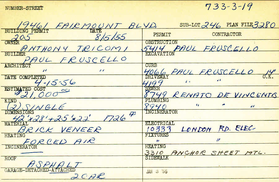 19461 Fairmount Boulevard Shaker Heights, OH 44120 PARCEL ID: 733-03-019 Building Permit Date: 08-05-1955 Plan File Number: 3280, 10280 Microfilm Roll: Roll#48, NewRoll#3 Neighborhood: Malvern Owner: Tricomi, Anthony Builder: Fruscello, Paul Architect: Fruscello, Paul Estimated Cost: 21000 Date Completed: 04-15-1956 Kind: Single, Single Residence or Dwelling (2) Material: Brick Veneer Heating: Forced Air Roof: Asphalt Garage: attached 2 car |