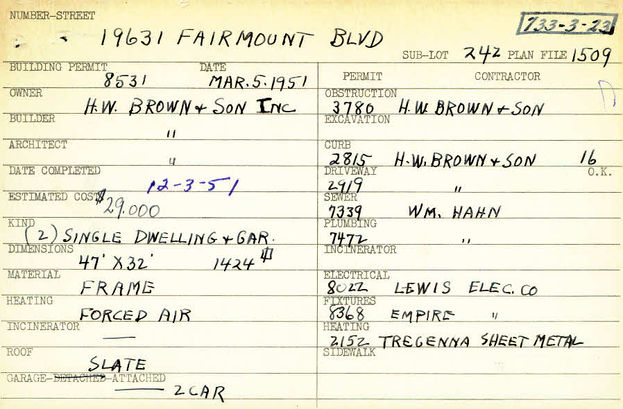 19631 Fairmount Boulevard Shaker Heights, OH 44120 PARCEL ID: 733-03-023 Building Permit Date: 03-05-1951 Plan File Number: 1509 scanned, 6673 Microfilm Roll: Roll024, Roll#87 Neighborhood: Malvern Owner: H. W. Brown and Son, Inc. Builder: H. W. Brown and Son, Inc. Architect: H. W. Brown and Son, Inc. Estimated Cost: 29000 Date Completed: 12-03-1951 Kind: Single Dwelling and Garage (2) Material: Frame Heating: Forced Air Roof: Slate Garage: attached 2 car |