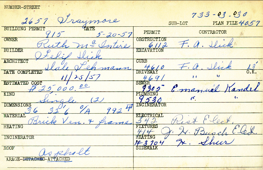 2657 Traymore Road Shaker Heights, OH 44122 PARCEL ID: 733-03-030 Building Permit Date: 05-20-1957 Plan File Number: 4057 Microfilm Roll: Roll#59 Neighborhood: Sussex Owner: McIntire, Ruth Builder: Dick, Felif Architect: Lehmann, Dale Estimated Cost: 25000 Date Completed: 11-25-1957 Kind: Single, Single Residence or Dwelling (2) Material: Brick Veneer and Frame Roof: Asphalt Garage: attached |