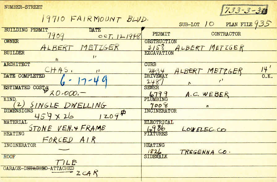 19710 Fairmount Boulevard Shaker Heights, OH 44120 PARCEL ID: 733-03-031 Building Permit Date: 10-12-1948 Plan File Number: 935 all scanned Microfilm Roll: Roll012 Neighborhood: Malvern Owner: Metzger, Albert Builder: Metzger, Albert Architect: Metzger, Charles A. Estimated Cost: 20000 Date Completed: 06-17-1949 Kind: Single, Single Residence or Dwelling (2) Material: Stone Veneer and Frame Heating: Forced Air Roof: Tile Garage: attached 2 car Card Available: Yes Blueprints: online, see link above |