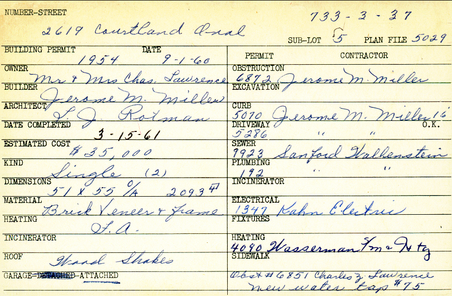 2619 Courtland Oval Shaker Heights, OH 44122 PARCEL ID: 733-03-037 Building Permit Date: 09-01-1960 Plan File Number: 5029 Microfilm Roll: Roll#69 Neighborhood: Malvern Owner: Lawrence, Mr. and Mrs. Charles Builder: Miller, Jerome M. Architect: Rotman, L. J. Estimated Cost: 35000 Date Completed: 03-15-1961 Kind: Single, Single Residence or Dwelling (2) Material: Brick Veneer and Frame Heating: Forced Air Roof: Wood Shakes Garage: attached |