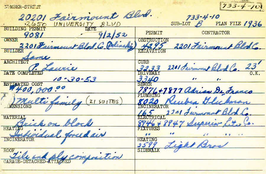 20201 Fairmount Boulevard Shaker Heights, OH 44120 PARCEL ID: 733-04-010 Building Permit Date: 09-02-1952 Plan File Number: 1936 all scanned Microfilm Roll: Roll029 Neighborhood: Malvern Owner: 2201 Fairmount Boulevard Company (Dolinsky) Builder: 2201 Fairmount Boulevard Company (Dolinsky) Architect: Laurie, P. Estimated Cost: 400000 Date Completed: 10-30-1953 Kind: Apartment or Multi-family (3+) Material: Brick on Block Heating: Forced Air Roof: Tile |