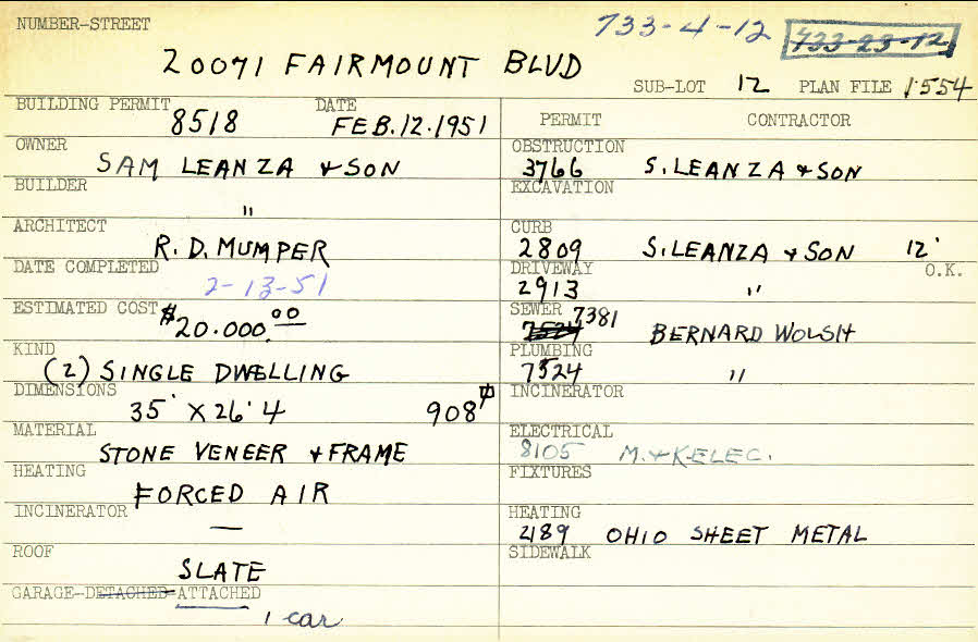20071 Fairmount Boulevard Shaker Heights, OH 44120 PARCEL ID: 733-04-012 Building Permit Date: 02-12-1951 Plan File Number: 1554 all scanned Microfilm Roll: Roll024 Neighborhood: Malvern Owner: Sam Leanza and Son Builder: Sam Leanza and Son Architect: Mumper, R. D. Estimated Cost: 20000 Date Completed: 02-13-1951 Kind: Single, Single Residence or Dwelling (2) Material: Stone Veneer and Frame Heating: Forced Air Roof: Slate Garage: attached |