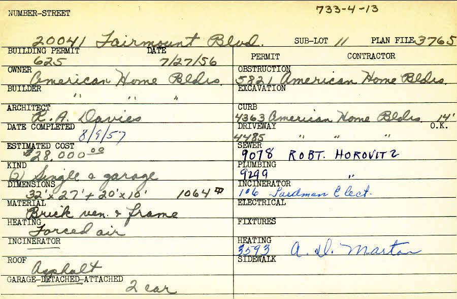 20041 Fairmount Boulevard Shaker Heights, OH 44120 PARCEL ID: 733-04-013 Building Permit Date: 07-27-1956 Plan File Number: 3765 Microfilm Roll: Roll#56 Neighborhood: Malvern Owner: American Home Builders Builder: American Home Builders Architect: Davies, R. A. Estimated Cost: 28000 Date Completed: 08-09-1957 Kind: Single Dwelling and Garage (2) Material: Brick Veneer and Frame Heating: Forced Air Roof: Asphalt Garage: detached 2 car |
