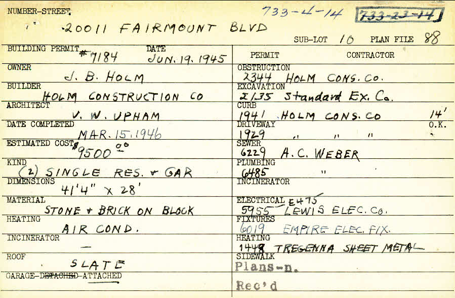 20011 Fairmount Boulevard Shaker Heights, OH 44120 PARCEL ID: 733-04-014 Building Permit Date: 06-19-1945 Plan File Number: 88, 2495 all scanned Microfilm Roll: Roll001, Roll035 Neighborhood: Malvern Owner: Holm, J. B. Builder: Holm Construction Company Architect: Upham, V. W. Estimated Cost: 9500 Date Completed: 03-15-1946 Kind: Single Dwelling and Garage (2) Material: Stone and Brick on Block Heating: Air Conditioned Roof: Slate Garage: attached |